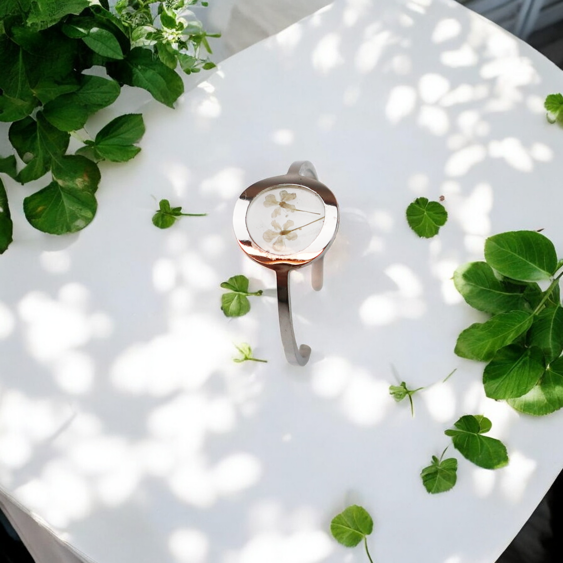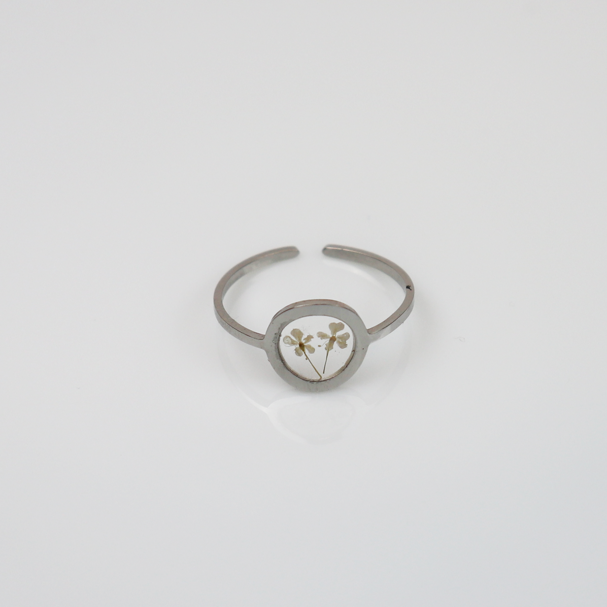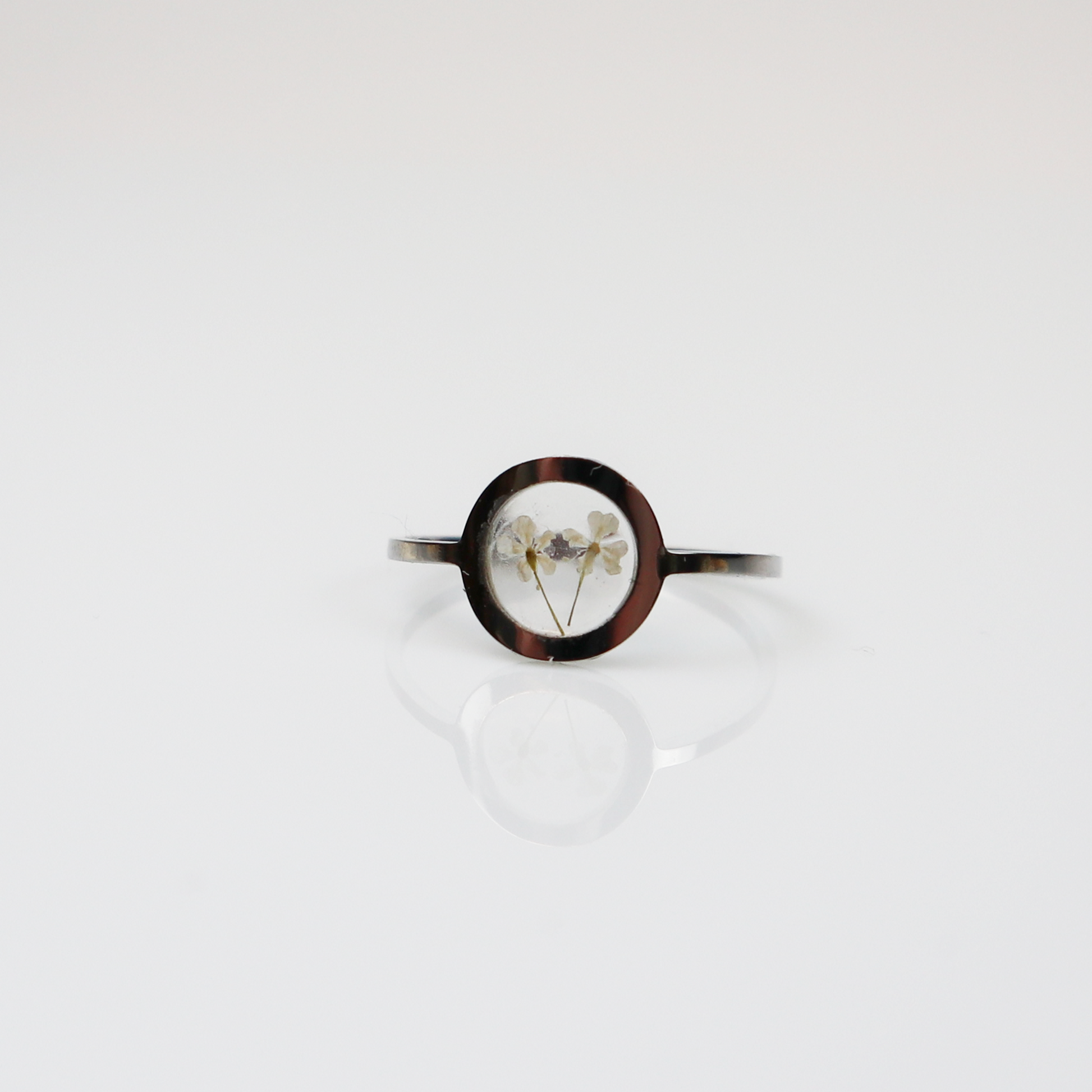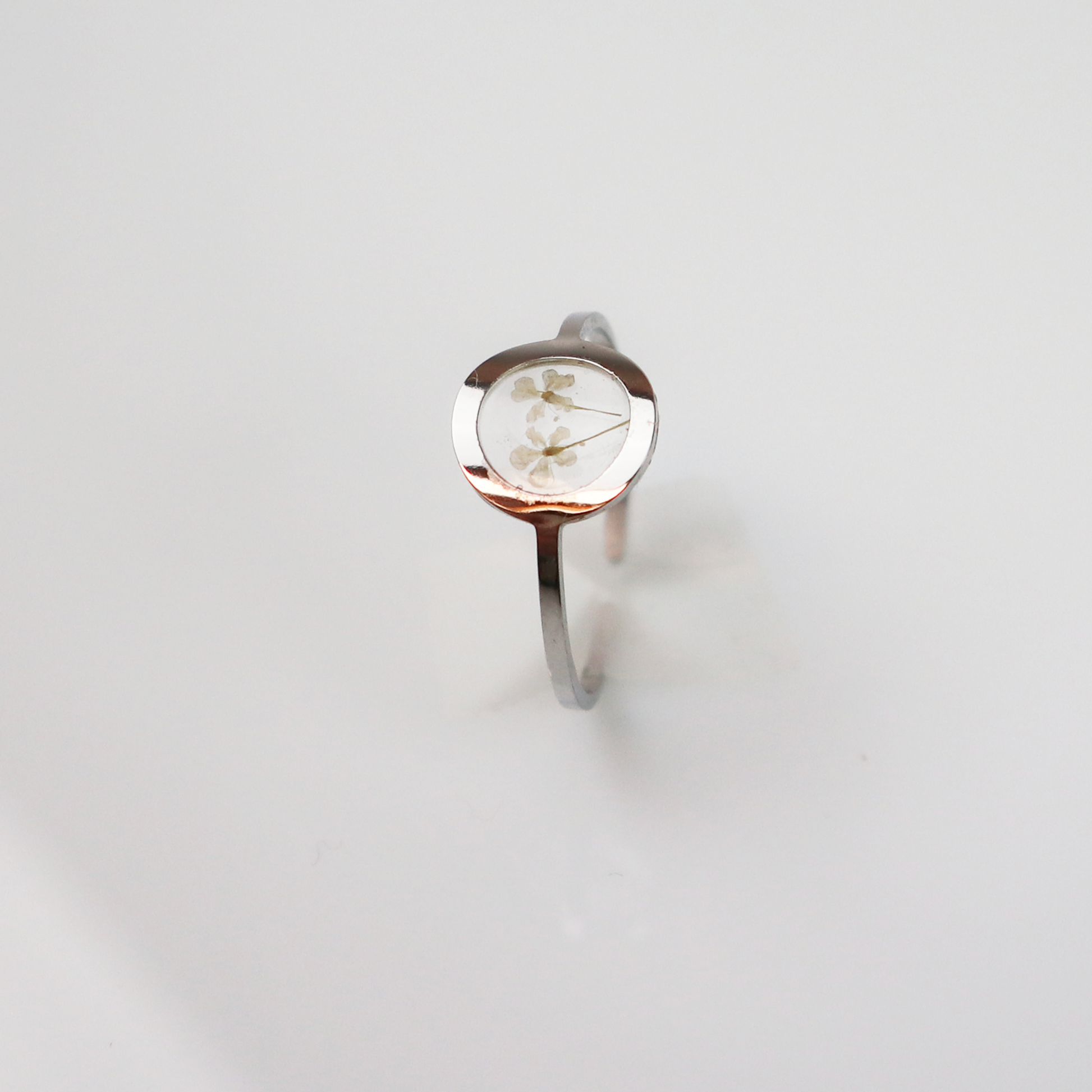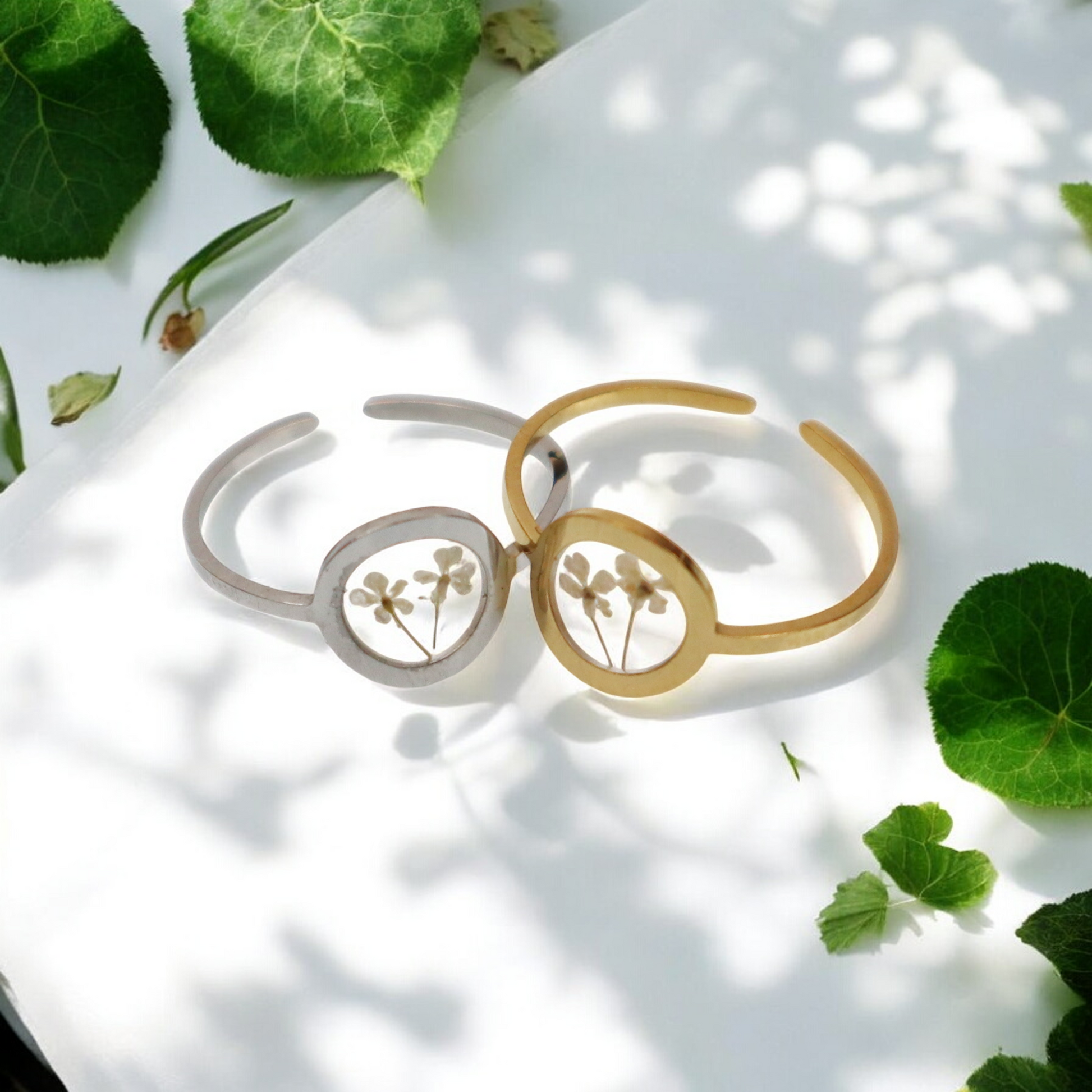Dieser wunderschöne handgefertigte Ring enthält zarte Dillblüten, auch Ammi majus genannt. Die Blumen sind sorgfältig in einem eleganten Goldring platziert, der verstellbar ist und somit für jede Fingergröße geeignet ist. Das dezente und zeitlose Design macht diesen Ring zu einem perfekten Andenken oder Geschenk und symbolisiert Schönheit und Anmut. Tragen Sie ein Stück Natur bei sich, immer stilvoll und bedeutungsvoll.