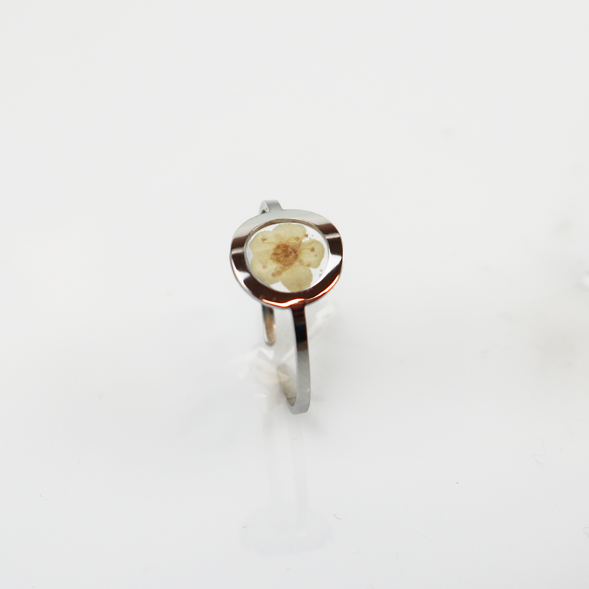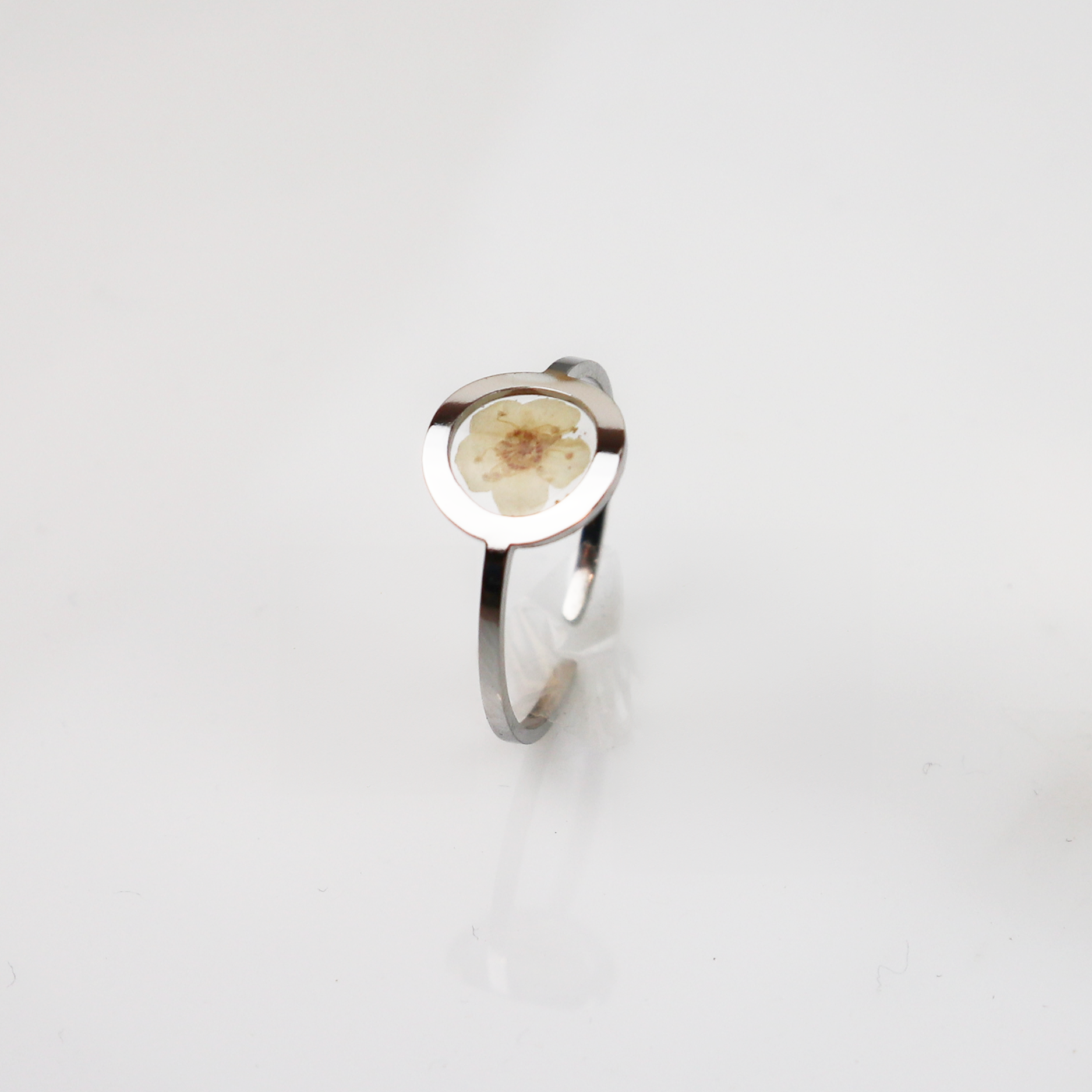 Deze unieke ring is met de hand vervaardigd en bevat een delicate witte bloesem van de pruimenboom. Het bloemetje is zorgvuldig verwerkt in een hoogwaardige hars, waardoor het wordt beschermd en zijn natuurlijke charme behoudt.