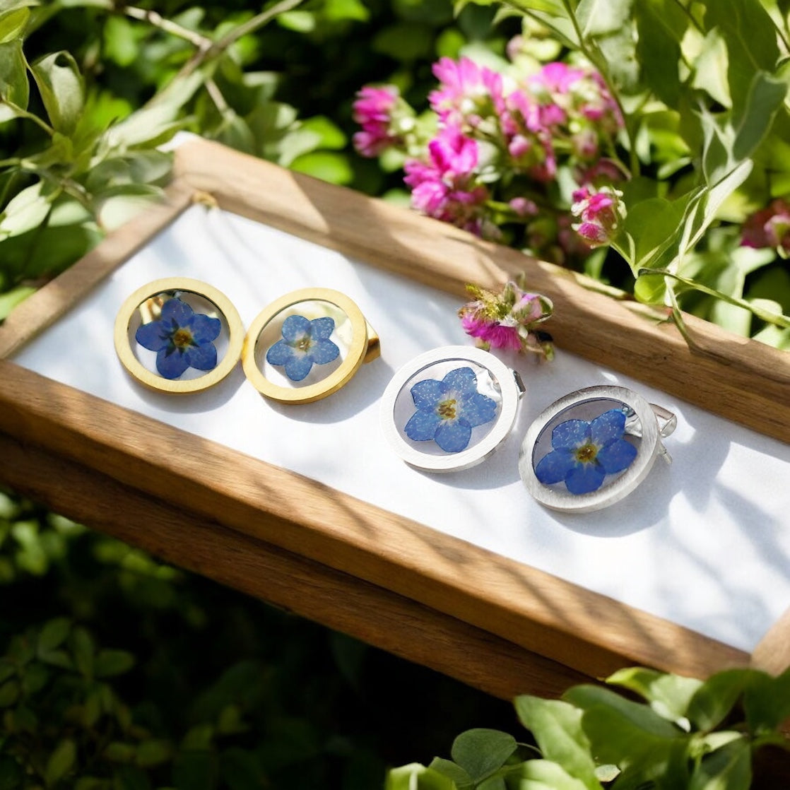 Naast onze verwisselbare druppel oorbellen hebben we ook vaste set oorbellen zoals de Oorbellen GeoL Vergeet Me Niet – Goud. Deze compacte, ronde oorbellen zijn gevuld met echte vergeet-me-nietjes. Verkrijgbaar in zowel een gouden als zilveren afwerking. Ze zijn lichtgewicht en comfortabel, perfect voor dagelijks gebruik of formele gelegenheden. Let op: deze set is niet magnetisch en niet verwisselbaar, maar straalt net zoveel karakter en betekenis uit.