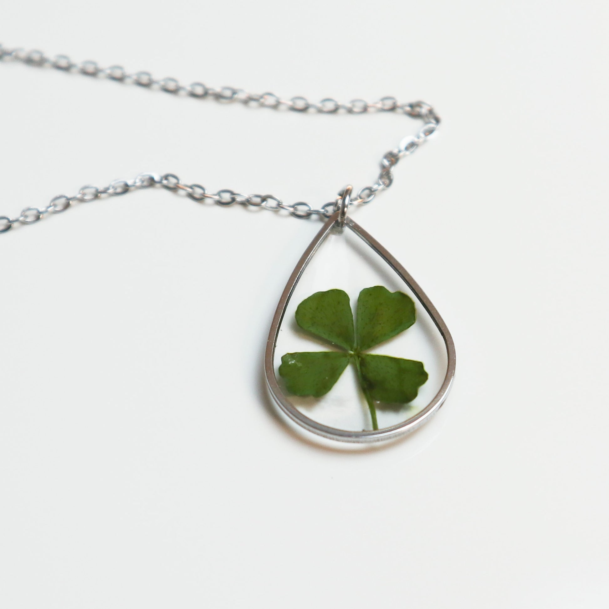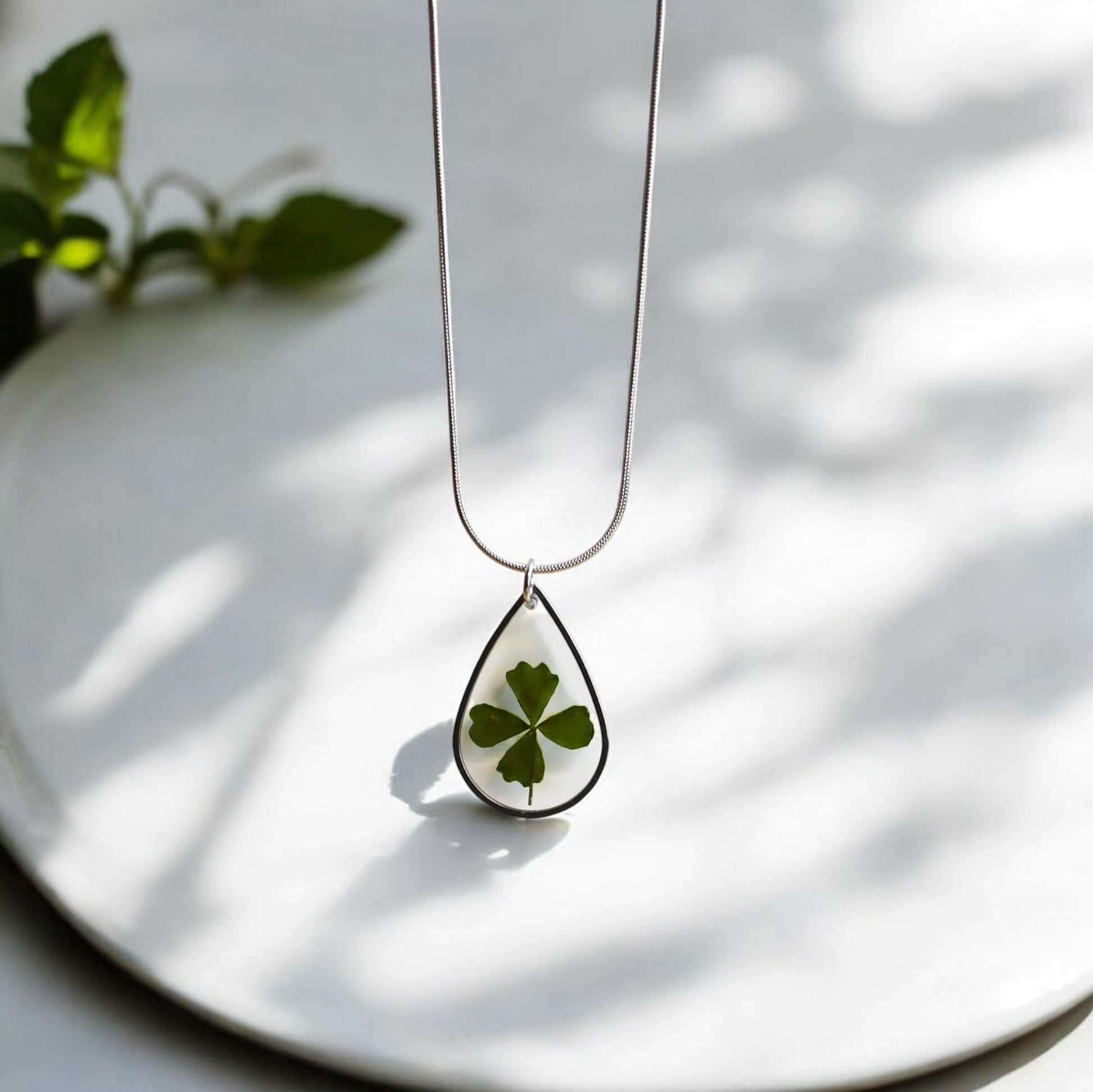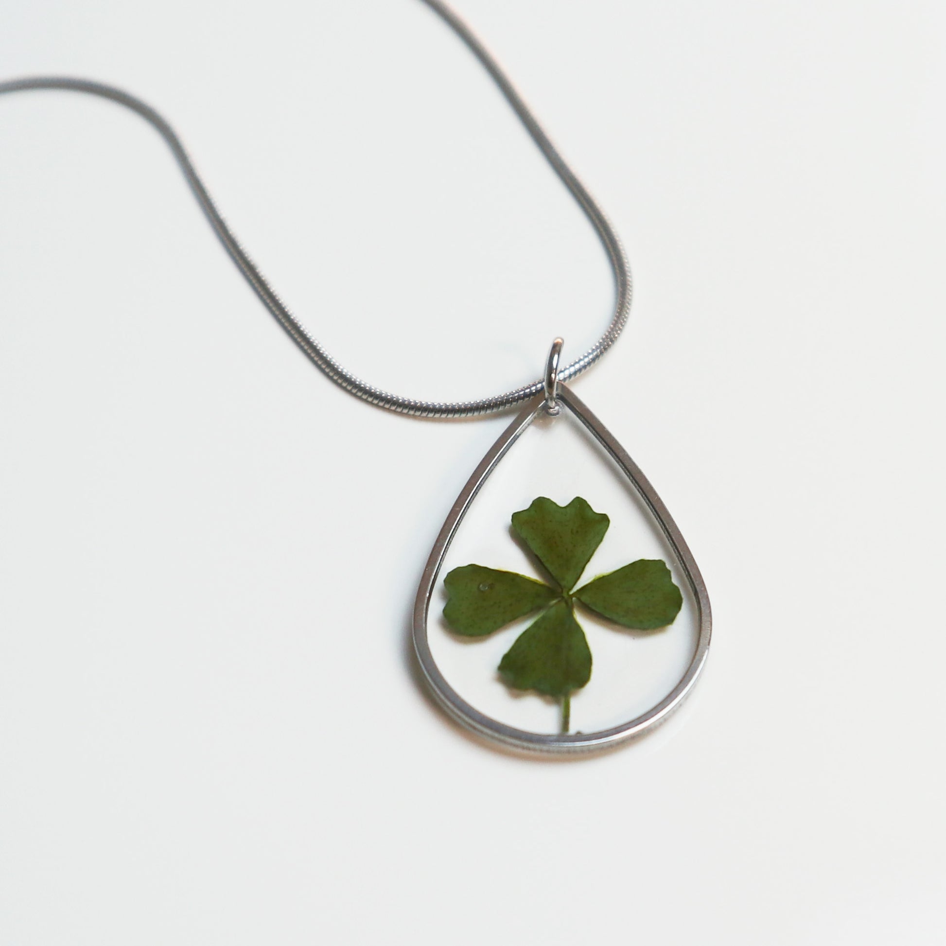 In deze platte, minimalistische, druppelvormige hanger is een echt klavertjevier verwerkt. Een zeldzaam en krachtig symbool voor geluk, hoop, liefde en vertrouwen. Dit maakt het een uniek en betekenisvol cadeau voor jezelf of iemand die je dierbaar is. Een klein sieraad dat je altijd dicht bij je draagt als teken van positieve energie.