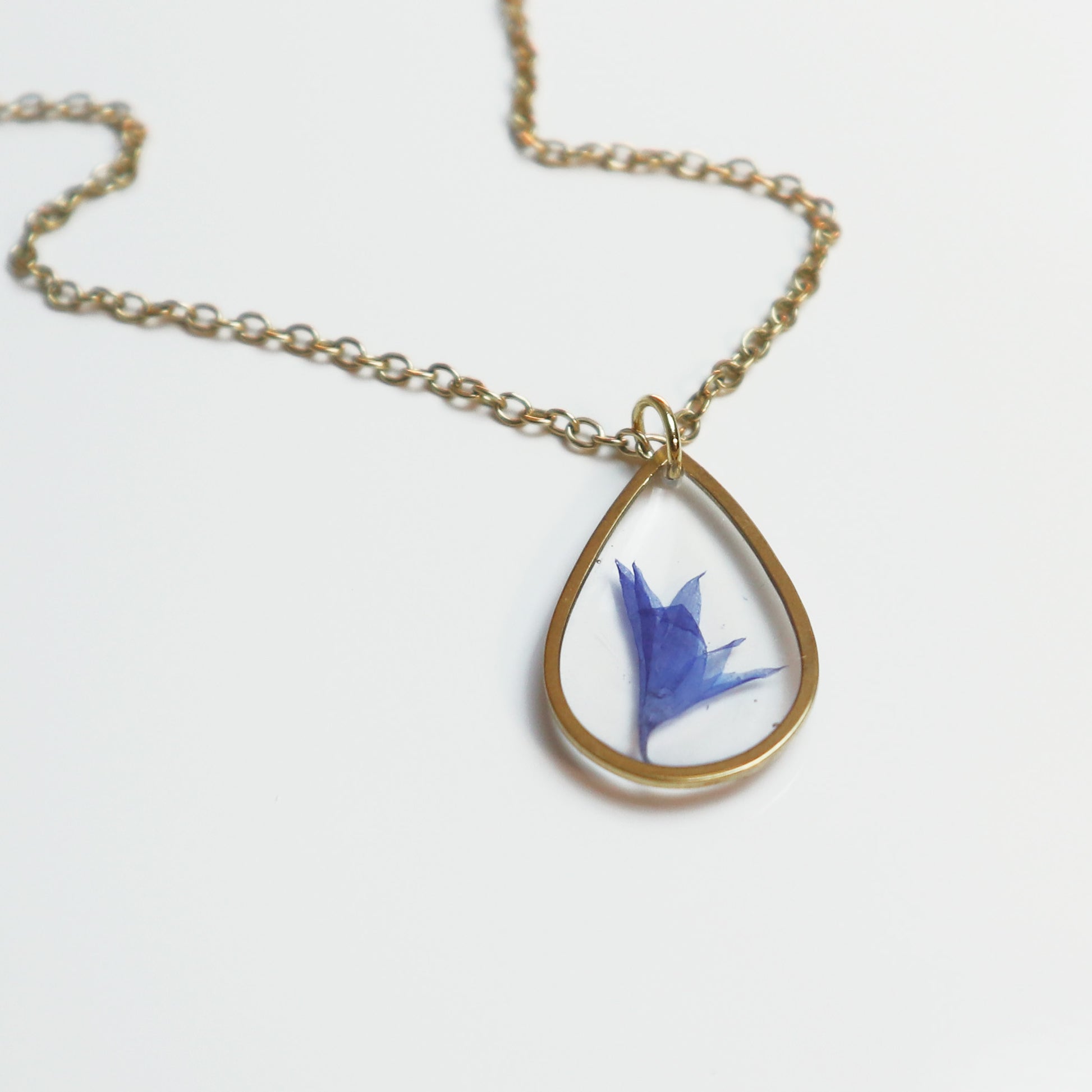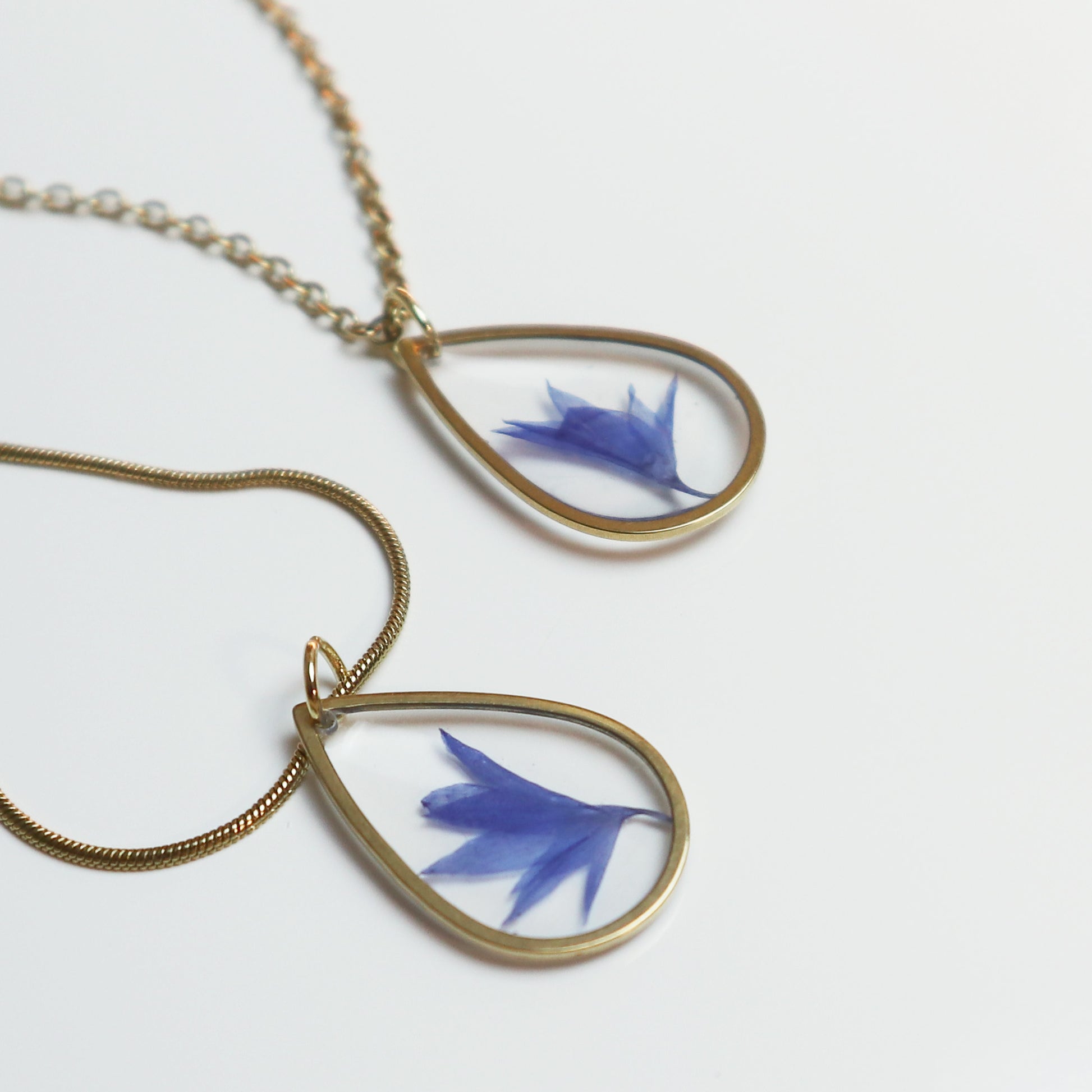 Waar een bos bloemen al snel verwelkt, blijft deze Drupt-hanger een duurzaam en origineel alternatief: de korenbloem blijft voor altijd stralen om je hals.