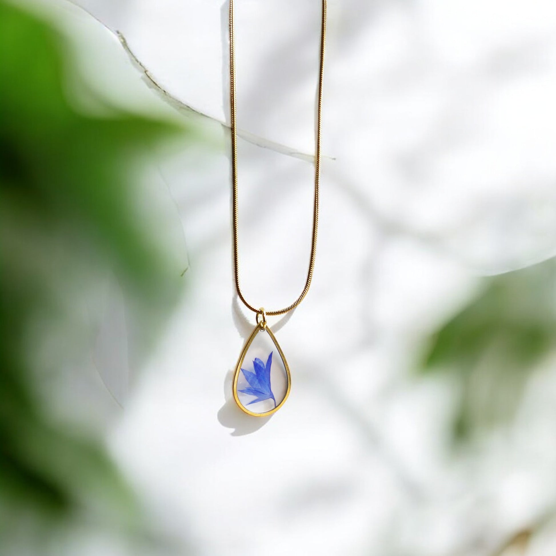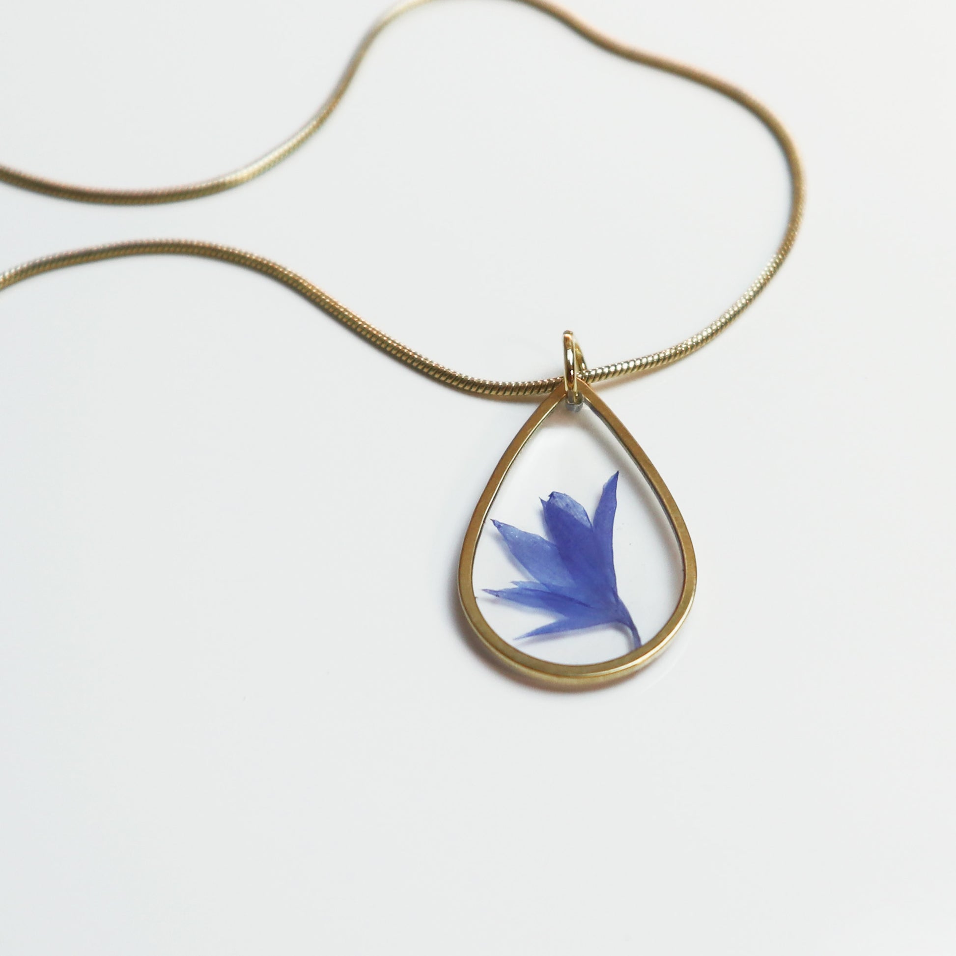 In deze platte, minimalistische, druppelvormige hanger zit één korenbloem, subtiel en verfijnd verwerkt. De korenbloem, symbool van trouw, zuiverheid en liefde, maakt dit tot een betekenisvol cadeau vol gevoel. Een klein sieraad dat de ontvanger altijd dicht bij zich kan dragen.