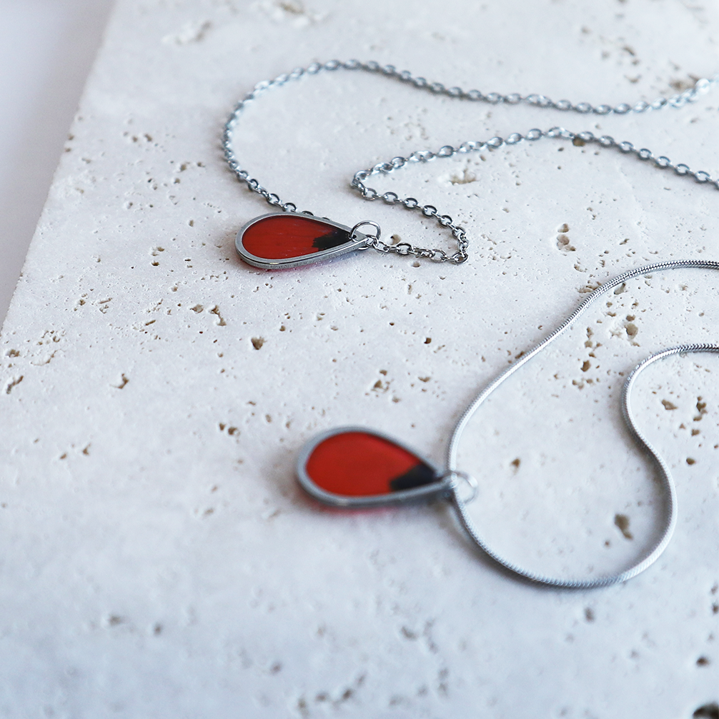 De klaproos-hanger heeft een voor- en achterkant; de achterzijde kan lichte imperfecties vertonen door de kwetsbaarheid van het echte blaadje dit is onvermijdelijk en onderdeel van het handgemaakte karakter.
