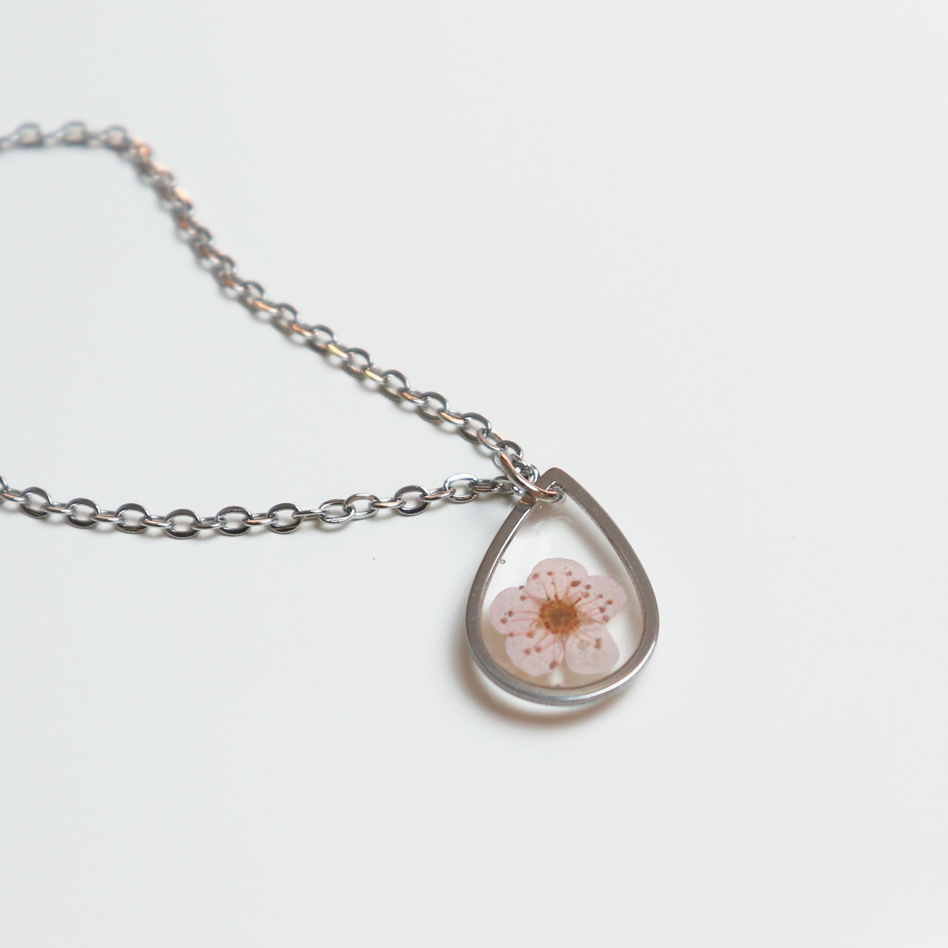In deze platte, minimalistische, druppelvormige hanger zit één delicate roze bloesem van de pruimenboom. Dit prachtige symbool van veerkracht, zuiverheid en een nieuw begin maakt het een bijzonder cadeau. De ontvanger zal dit altijd koesteren.