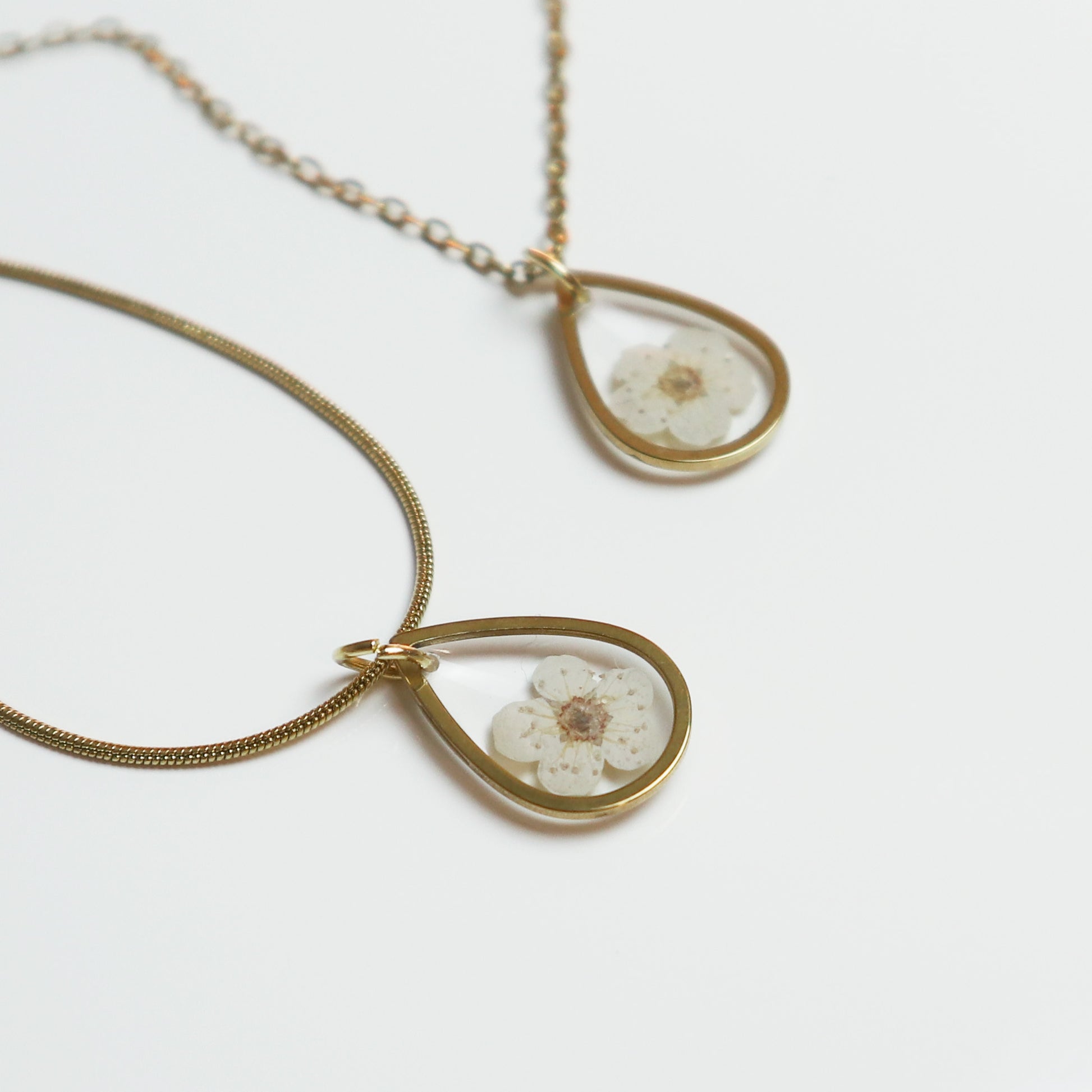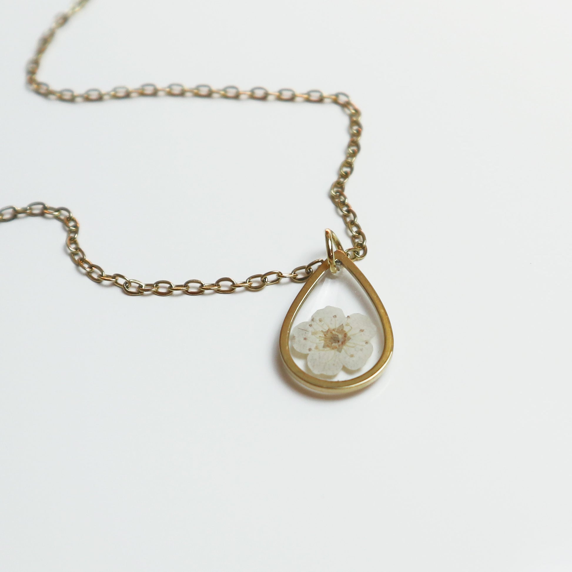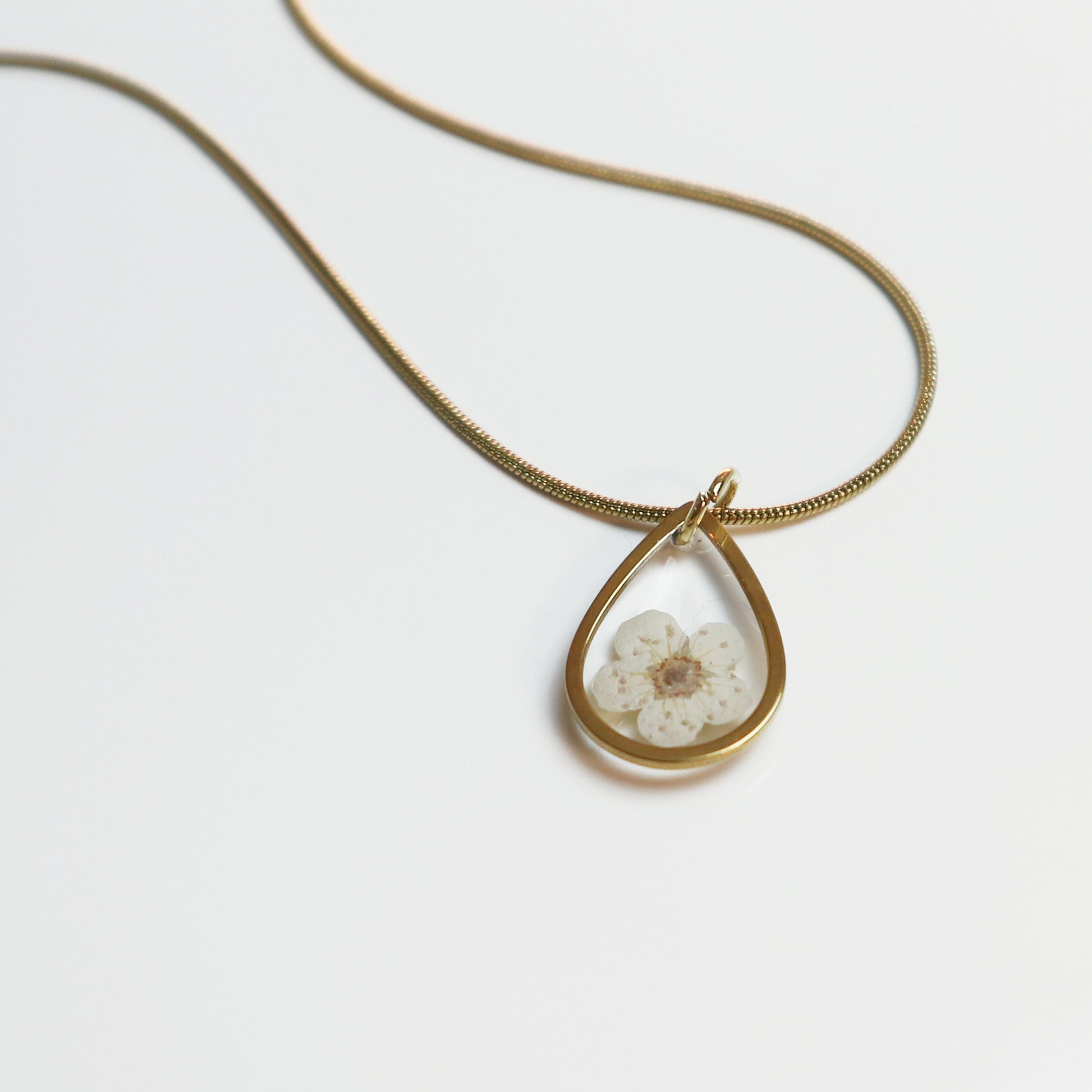 In deze platte, minimalistische, druppelvormige hanger zit één delicate witte bloesem van de pruimenboom. Dit prachtige symbool van veerkracht, zuiverheid en een nieuw begin maakt het een bijzonder cadeau. De ontvanger zal dit altijd koesteren.