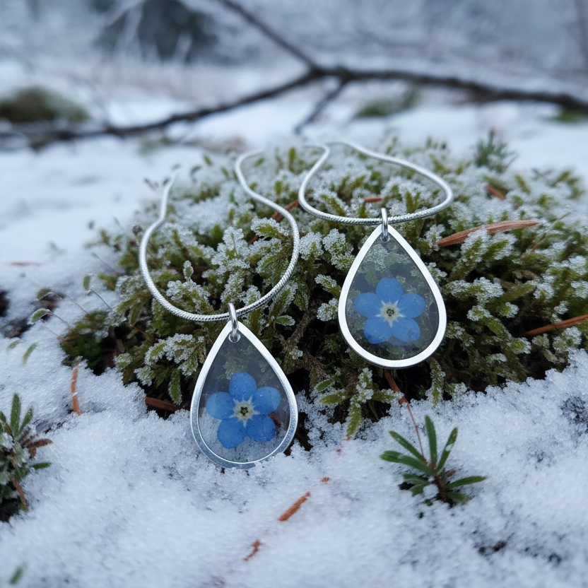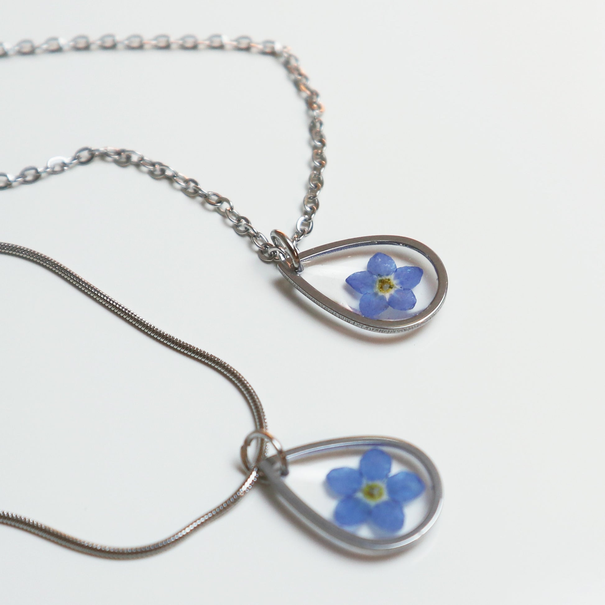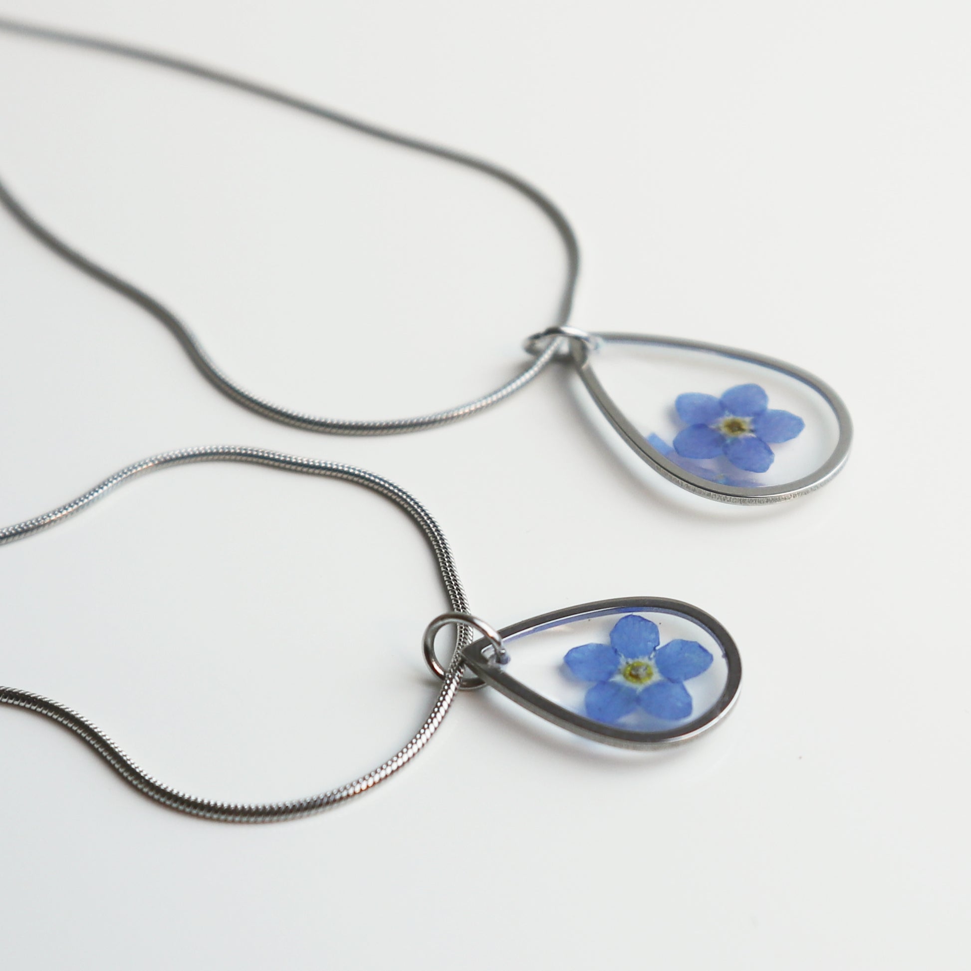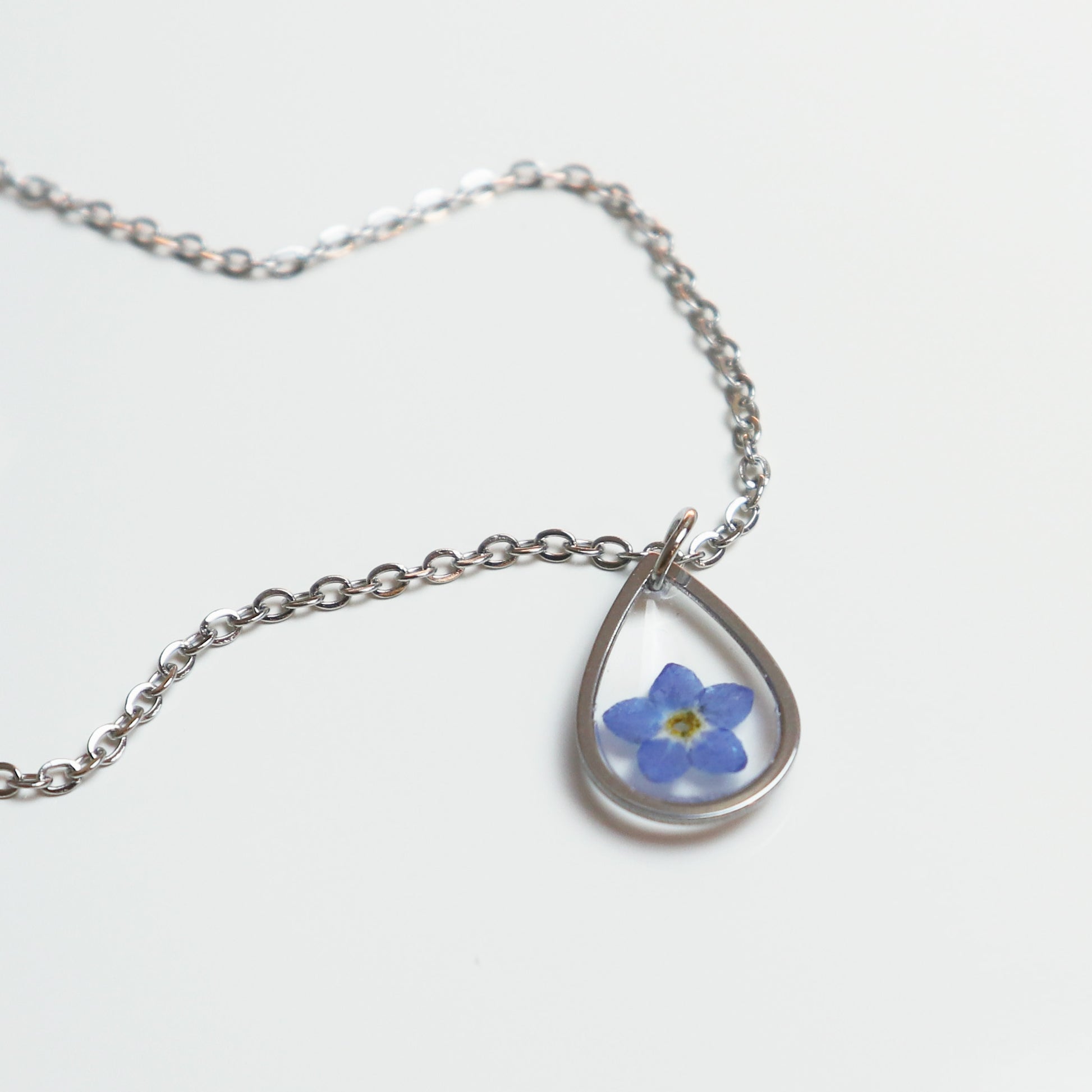 In deze platte, minimalistische, druppelvormige hanger zit één gedroogd vergeet-me-nietje. Dit prachtige symbool van liefde, herinnering en verbondenheid maakt het een bijzonder cadeau. De ontvanger zal dit nooit vergeten.