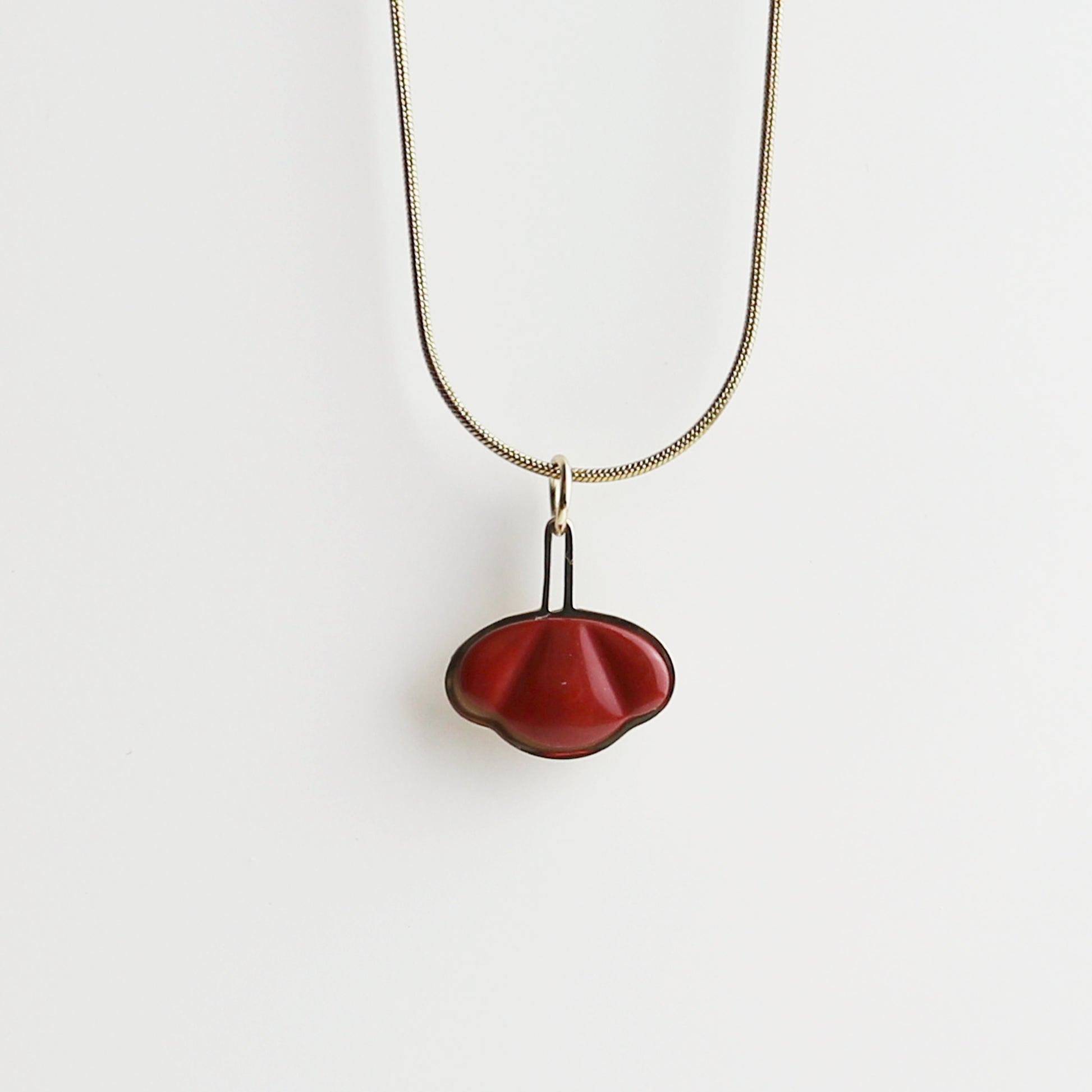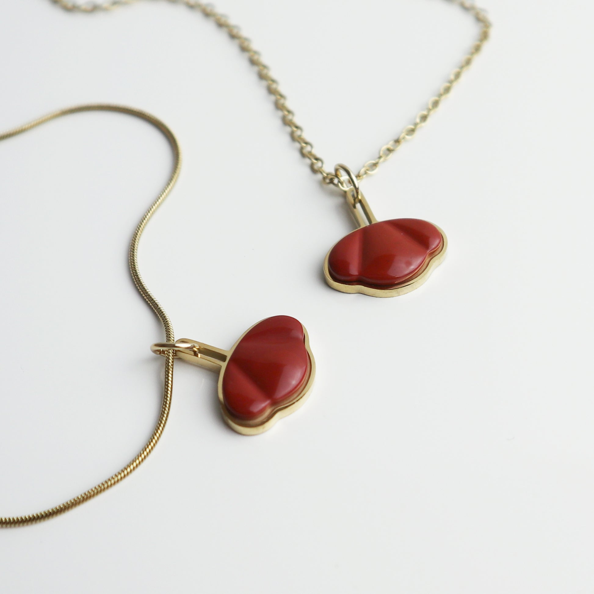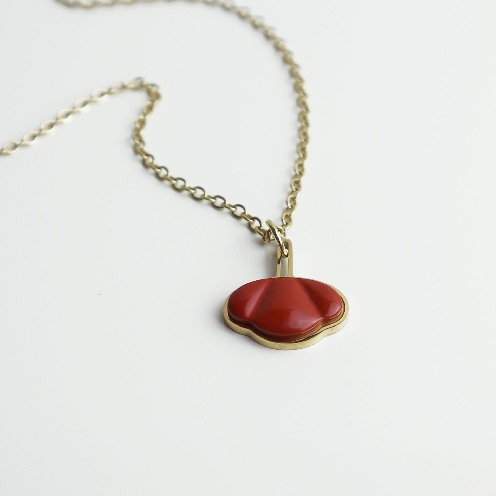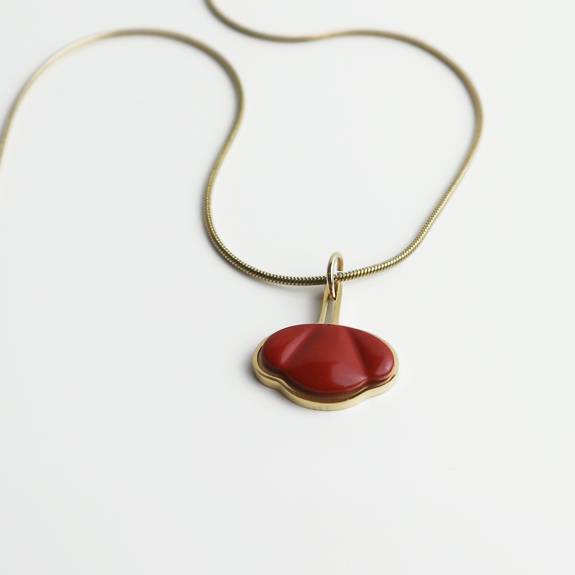 Deze hanger is gemaakt van echte rode jaspis (edelsteen), geslepen in de vorm van een klaproos. Met de hand geselecteerd en gezet in het goud. Elke steen heeft zijn eigen natuurlijke tekening en is daardoor uniek.